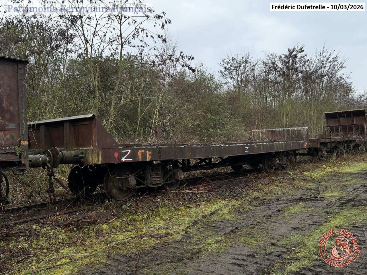Wagon de construction locale avec haussettes d’extrémité fixes, monté sur bogies provenant d’un wagon USA 18. Utilisé chez Usinor avec le numéro 763 21. Arrivé au CEF Nord en 1990. Ferraillé le 10 mars 2026.
