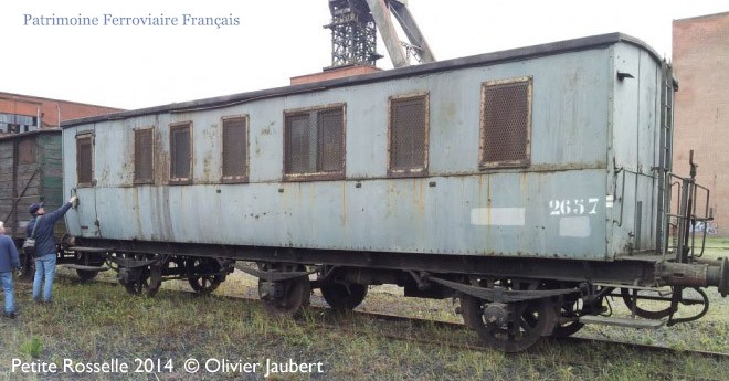 Voiture ayant subi d’importantes modifications par transformation en voiture-atelier par les HBL et numérotée 2657. L’intérieur de la voiture est resté en l’état depuis la fin de l’activité des HBL. Préservé sur le site du Parc Explor Wendel – Musée Les Mineurs à Petite Rosselle (Moselle)