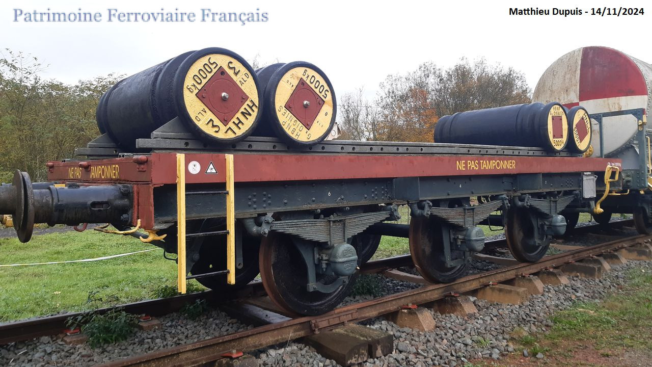 Équipé d’un frein à rochet. Chargé de 4 masses de 5 t marquées « HNLL » et « HBNP Oignies ». Préservé au CMCF, qui l’a restauré en 2015
