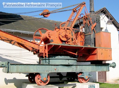 Grue de manutention automotrice à vapeur, mue par deux cylindres calés à 90°. Modèle identique à l’exemplaire de RFVL, avec laquelle elle était en service précédemment. Préservée au Musée Dufresne à Azay-le-Rideau. Précédemment en fonction dans une scierie à Cerqueux (Maine-et-Loire).