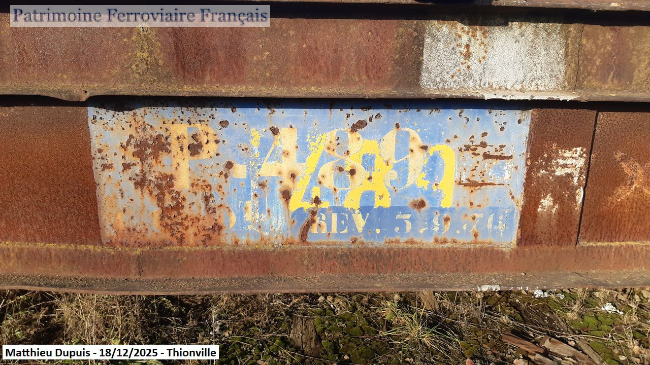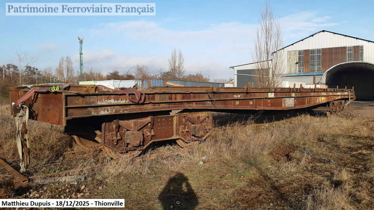 Wagon plat monté sur bogies d’origine allemands. Châssis soudé, probablement de fabrication locale Les tampons sont manquants sur une extrémité et sur l’autre, un plongeur est absent et le crochet de traction est cassé. Dernière révision le 03 septembre 1976. Situé dans les emprises d’anciens ateliers sidérurgiques à Thionville, occupés par l’entreprise LTM Colors Sarl à Thionville (Moselle) depuis 1979. Utilisé pour le stockage de grandes pièces.