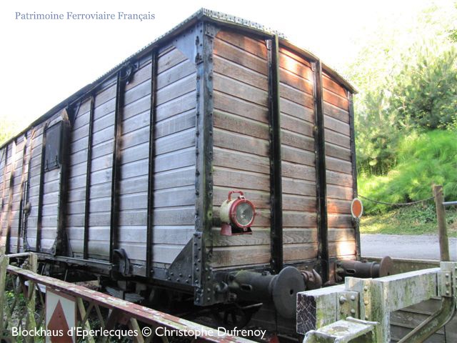 Série de wagons couvert Nord de 20 tonnes. Préservé à côté du blockhaus d’Éperlecques. Équipé d’une lanterne de queue unifiée SNCF en aluminium dite « cocotte-minute » apparue dans les années 50-60.