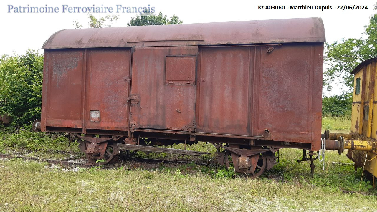 Couvert métallique dit « à dôme » de la compagnie du Nord, encore équipé de son système de freinage. Immatriculé KKzuw 259060 au Nord, puis Kz-403060 à la SNCF (région 2). Dernière révision à Loches le 07 mai 1965. Transféré à Veuxhaulles-sur-Aube (Côte-d’Or) en novembre 2024. Précédemment stationné en gare de Wassy (Haute-Marne). Propriété d’un particulier.