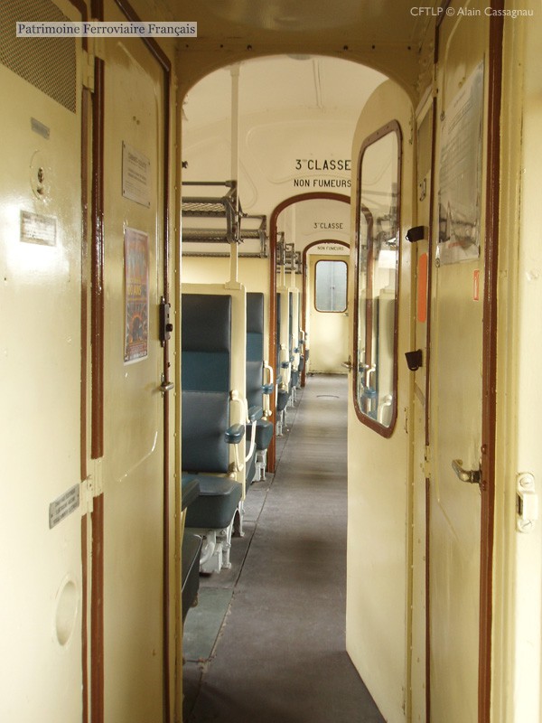 Marquages extérieurs remis en 3e classe par le CFTLP. Concernant la livrée intérieure, l’association a repassée la voiture en livrée Nord (jaune avec huisseries chocolat). Ci-dessous, trois photos de l’intérieur de la voiture :