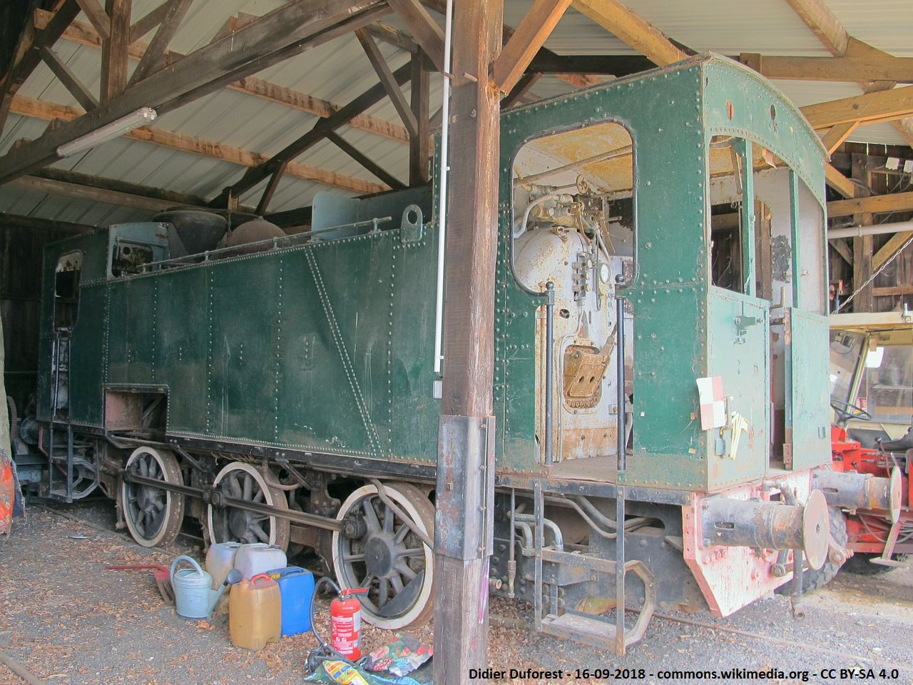 Note : seule machine bicabine préservée en voie normale. Foyer en cuivre. En attente de rénovation.