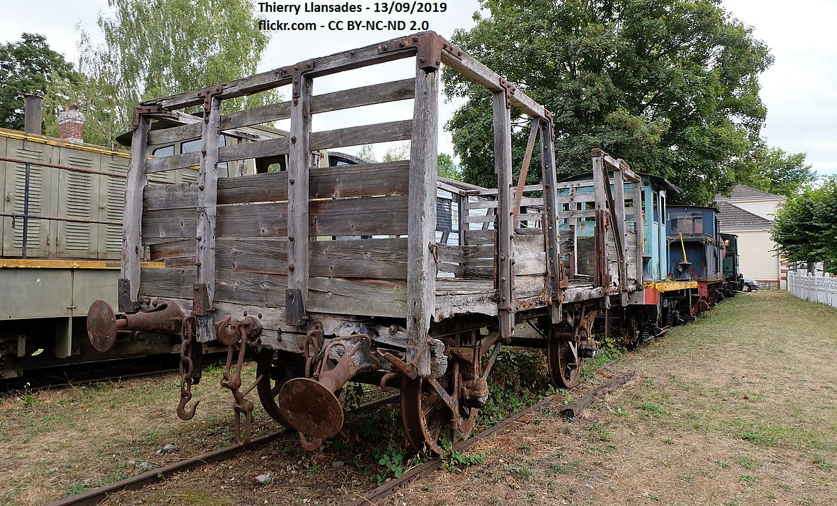 Wagon tombereau à claires-voies pour le transport de bidons de lait, construit pour la Compagnie de l’Ouest. À châssis en buis avec brancards métalliques rivetés. Précédemment chez un particulier à Cramoisy (Oise). Propriété d’Alain Mionnet. Transféré en gare de Pont-sous-Gallardon (Eure-et-Loir) en septembre 2021. Précédemment hébergé au CFVE.