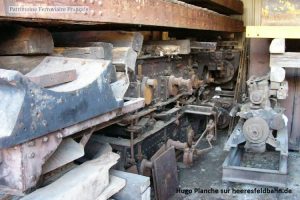 Châssis de deux locomotives à vapeur type Brigadelok construites par Borsig en 1918, numéro 10329 (Heeresfeldbahn 2198) et numéro 10357 (Heeresfeldbahn 2294). Proviennent de l’usine de sucre Lesmierz en Pologne, où elles servaient déjà de réserves de pièces.