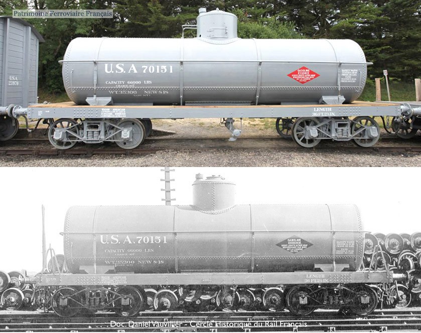 Possède encore ses tampons type État. Seul exemplaire parmi les citernes USA 1918 préservées encore équipée de la main courante faisant le tour complet de la cuve.