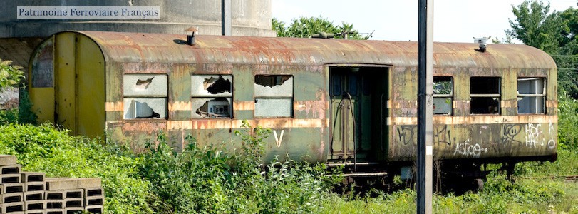 Modernisation (caisse métallique) entre 1953 et 1961 par la SNCF. Voiture située sur le triage SNCF du Petit Thérain à Saint-Leu-d’Esserent, près de Creil.