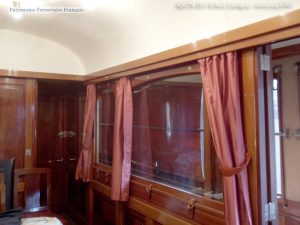 Excellent état intérieur mais a perdu son mobilier. Parmi les raffinements notables de l’aménagement on peut noter les volets en bois qui coulissent verticalement pour obturer les vitrages de la cloison séparant le salon du couloir (sangles visibles sur la photo ci-dessous).