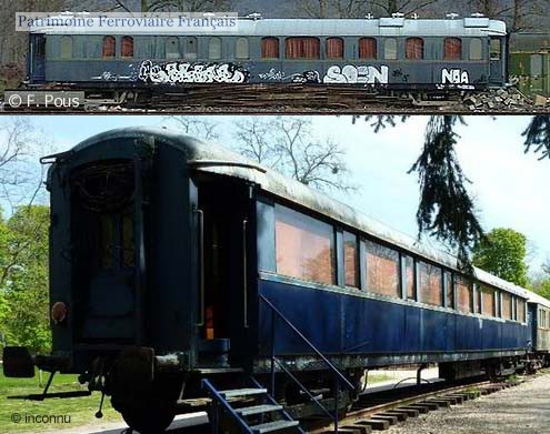 Initialement préservée par la CITEV. Cette voiture aurait été garée à Capdenac pendant un temps (photo du haut, prise dans cette gare). Elle s’est trouvée ensuite au Château de La Ferté-Saint-Aubin (photo du bas). Mise en ventes aux enchères, elle a été rachetée le 5 juin 2010 par un collectionneur privé résidant en Seine-Maritime.