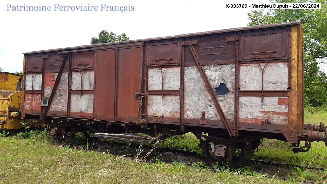 Caisse ayant reçu un tôlage partiel en partie supérieure. Immatriculé à la SNCF K-333769 (région 5), puis plus tard 01 87 129 4 329-1 Gs. Transféré à Veuxhaulles-sur-Aube (Côte-d’Or) en novembre 2024. Précédemment stationné en gare de Wassy (Haute-Marne). Propriété d’un particulier.