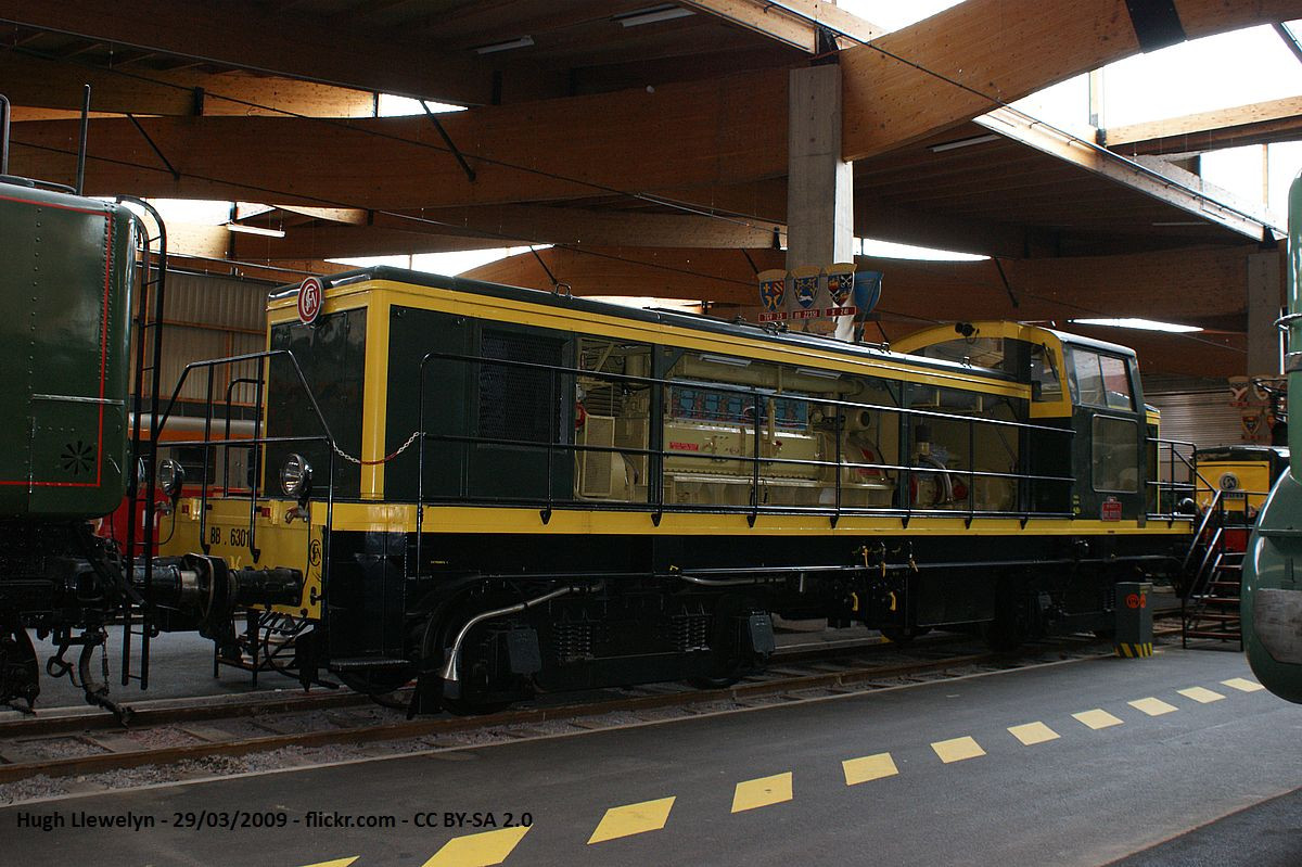 Immatriculé à l’origine 040-DE-13. Les panneaux mobiles du grand capot côté gauche ont été retirés et remplacés par du plexiglas pour montrer les différents éléments internes. Préservé à la Cité du Train.