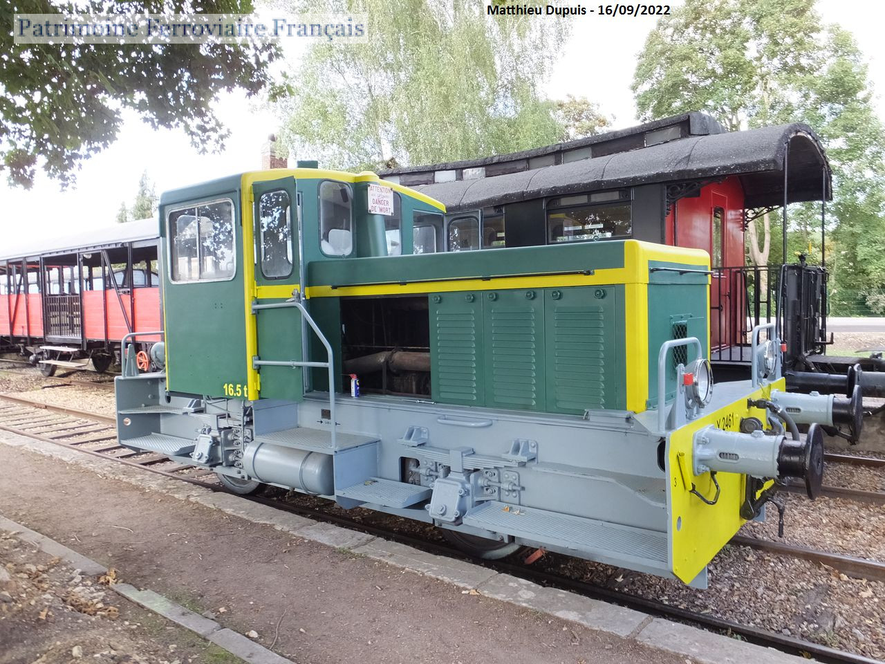 Remis en état de marche par le CFVE, qui l’ensuite repeint en livrée SNCF verte à bandes jaunes et châssis gris. Le numéro SNCF a été retrouvé lors du décapage.