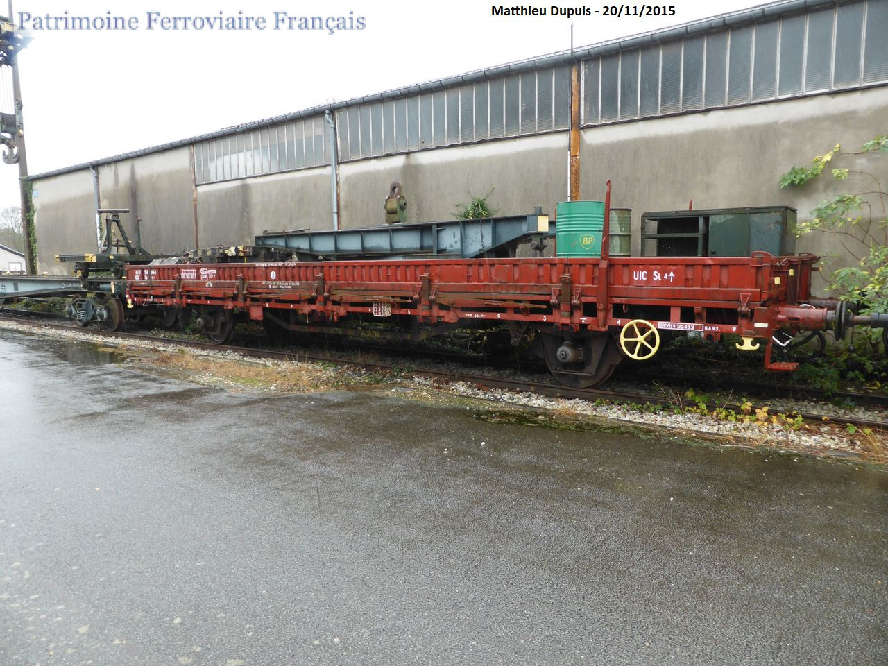 Wagon plat faisant partie de la rame de la grue Diplodocus et destiné au transport des agrès. Préservé à l’ex-5e Régiment du Génie à Versailles-Matelots.