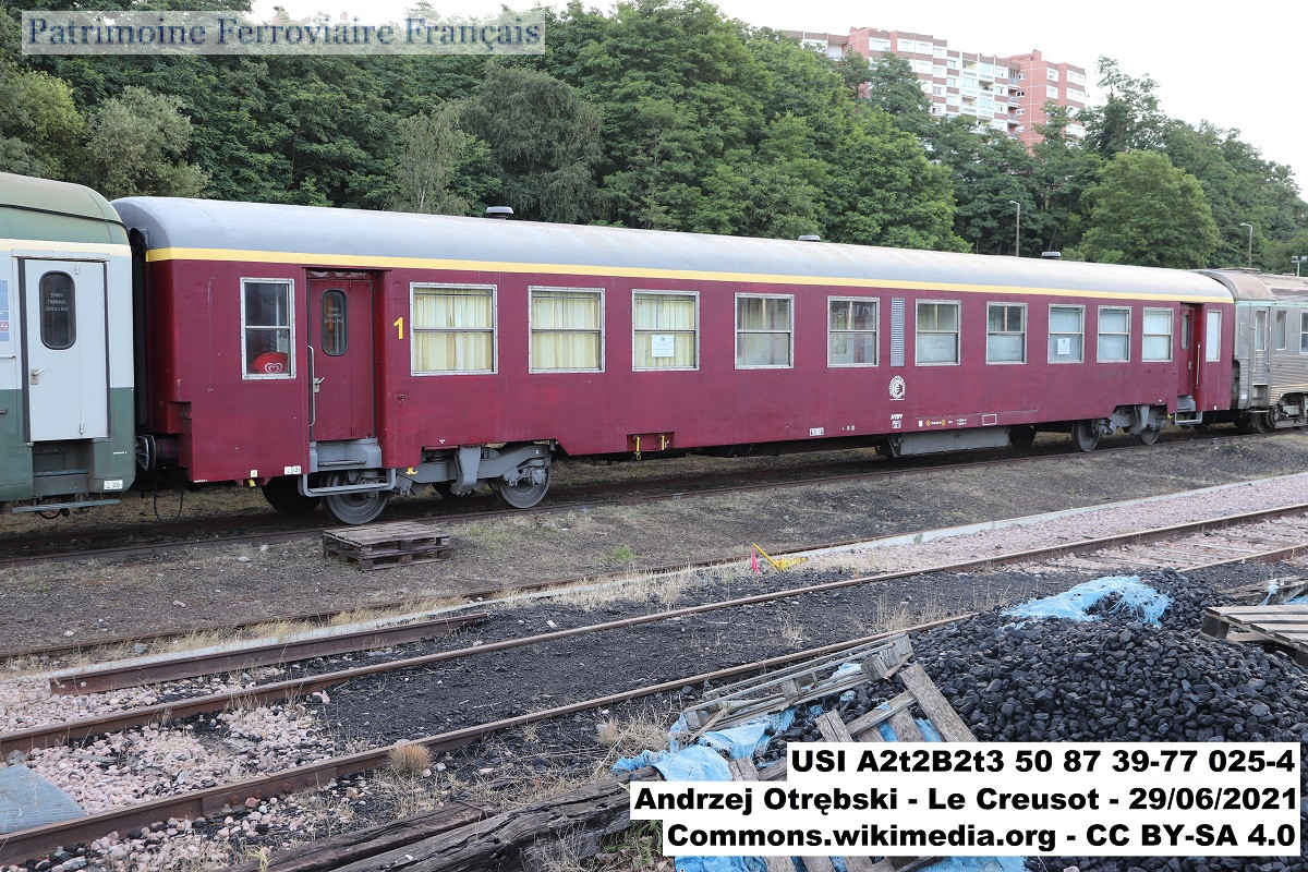 Ancienne voiture de première classe à compartiments A4t4, transformée en 1985-1986 par la SNCF en voiture mixte première-deuxième classe et immatriculée 50 87 39-77 025-4 A2t2B2t3. Repeinte dans une livrée rouge fantaisiste en 2016, et utilisée comme voiture-bar. Enregistrée à l’EPSF avec l’immatriculation 55 87 39-77 025-0 F-CFC. Apte à circuler sur le RFN. Propriété de la SNCF, mise à disposition sous convention.