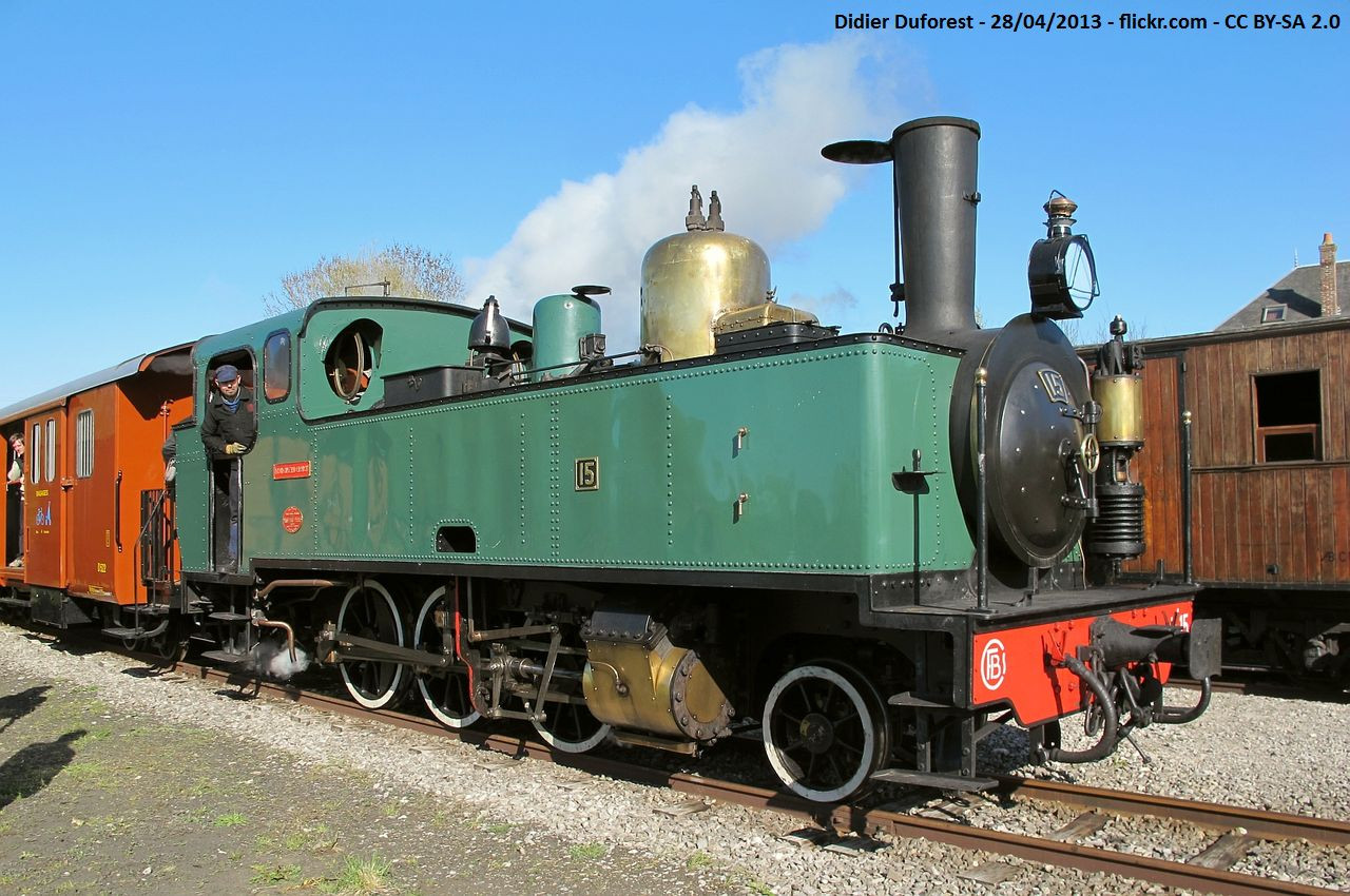 Mise en service sur le réseau de l’Oise de la Compagnie Générale des Voies Ferrées d’Intérêt Local (CGL/VFIL) , numérotée 15, et affectée en premierà la ligne Noyon-Guiscard-Lassigny. Trasnférée ensuite sur la ligne de Saint-Just-en-Chaussée à Crèvecœur-le-Grand, et utilisée jusqu’en avril 1961. Initialement préservée pour un projet de musée dédié aux chemins de fer secondaires à Verneuil (Marne). Ce projet n’ayant pas abouti, la machine arrive en 1971 au CFBS.