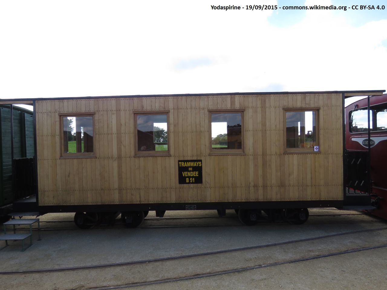 Issue d’une série de 5 voitures livrées pour la Société du chemin de fer sur route de Challans à Fromentine. Récupérée dans un jardin à La Roche-sur-Yon et posée sur des bogies à voie de 60 cm.
